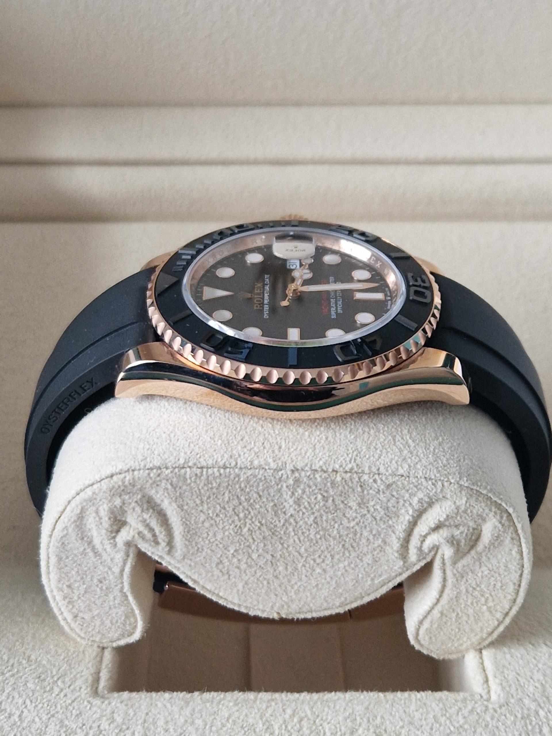 An Unworn 40mm case size, Rose Gold , Calibre 3235 , Automatic Movement , ROLEX YACHT-MASTER 40 [126655] , Black Baton Dial , With a Date Aperture at 3 O’clock , Surrounded by a Rose Gold and Black Ceramic 60 Minute Bezel on a Black ROLEX OysterFlex Bracelet. Complete Set including ROLEX Box , 2x Swing Tickets and all Relevant Paperwork , Originally Supplied as new in May 2022.